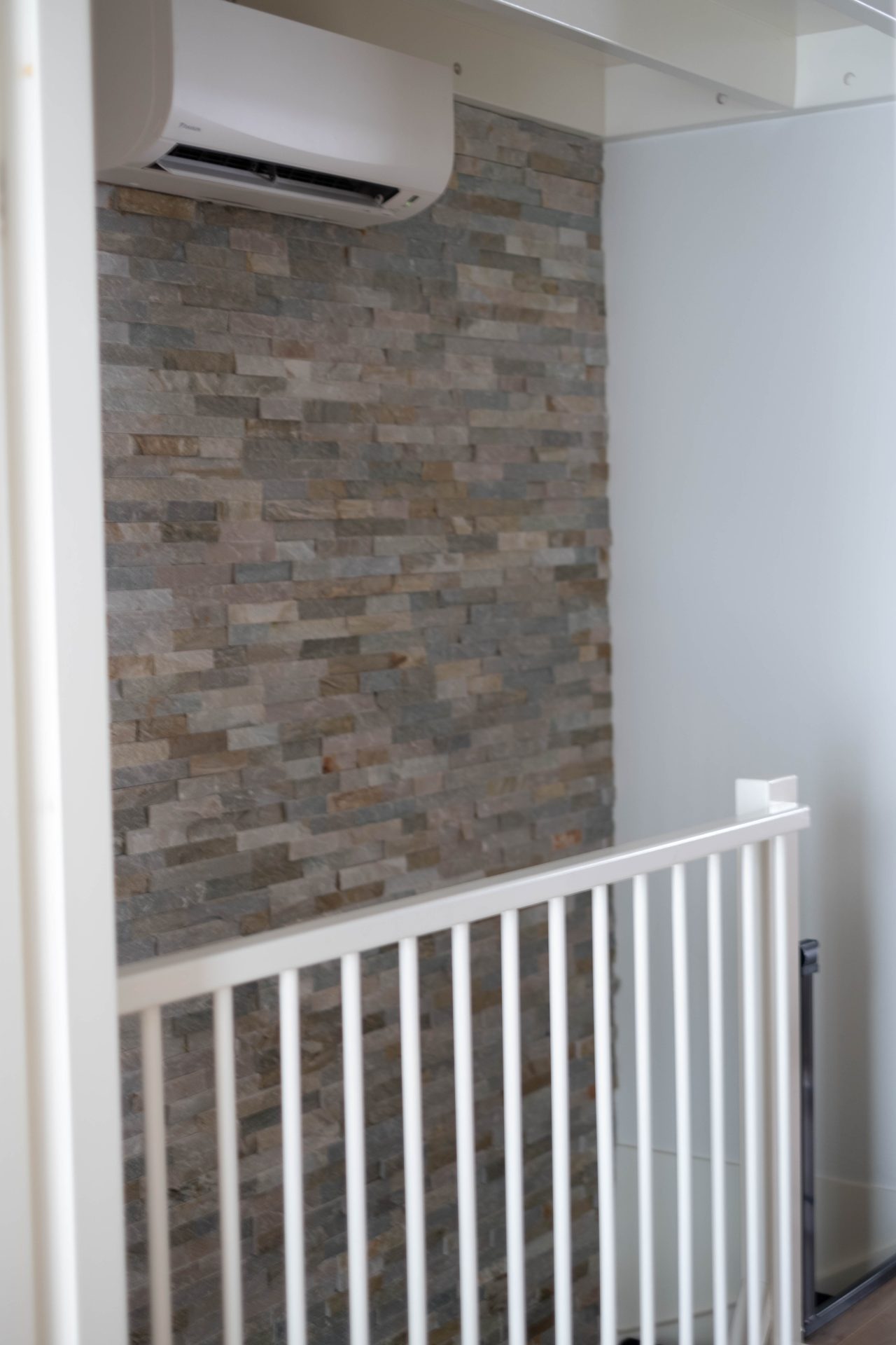 De elektra is uit de kamer ernaast gehaald; via het stopcontact direct naar de buitenmuur (onze buren hebben aan die kant geen 2e verdieping). En op de buitenmuur, boven het dak van onze buren, hangt de buitenunit en de koppeling met elektra. Dus binnen hebben we geen draden / kabelgoot.