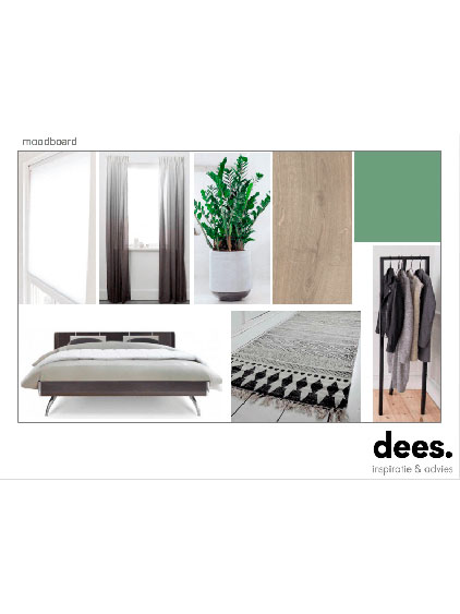 Een nieuwe start met een vernieuwde slaapkamer, of ik daarbij kon helpen? Natuurlijk! Het moderne bed was het uitgangspunt voor een modern, licht en fris moodboard. Zoals gevraagd ligt de focus op de basis zoals de vloer, vitrage en kleurgebruik.