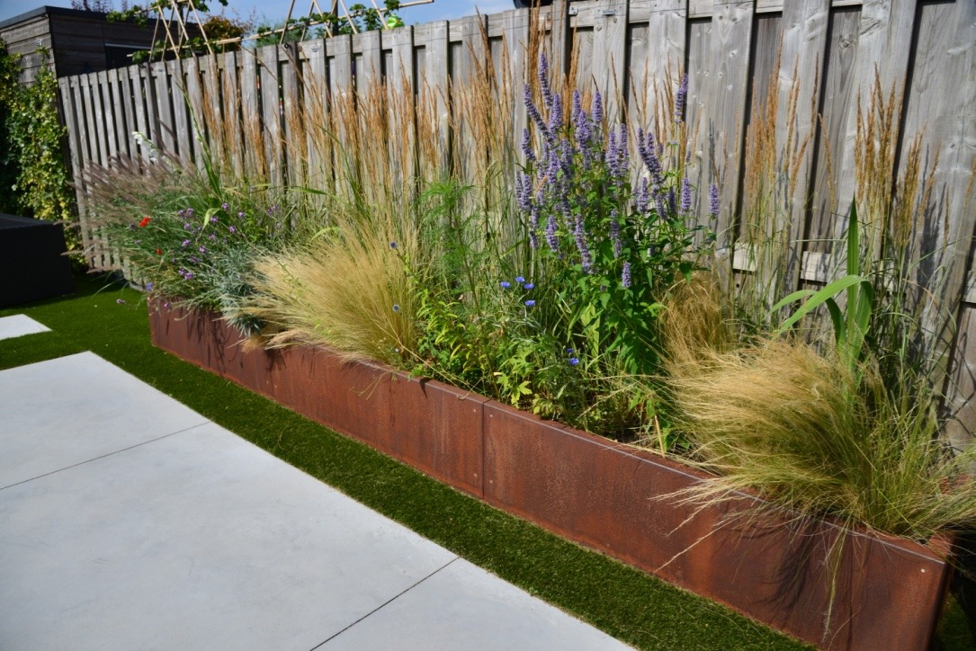 Als staal-liefhebber en voor het kleuraccent kon cortenstaal niet ontbreken in deze tuin. De plantenbak van 4,5m en de ophoging zijn ermee ‘bekleed’.