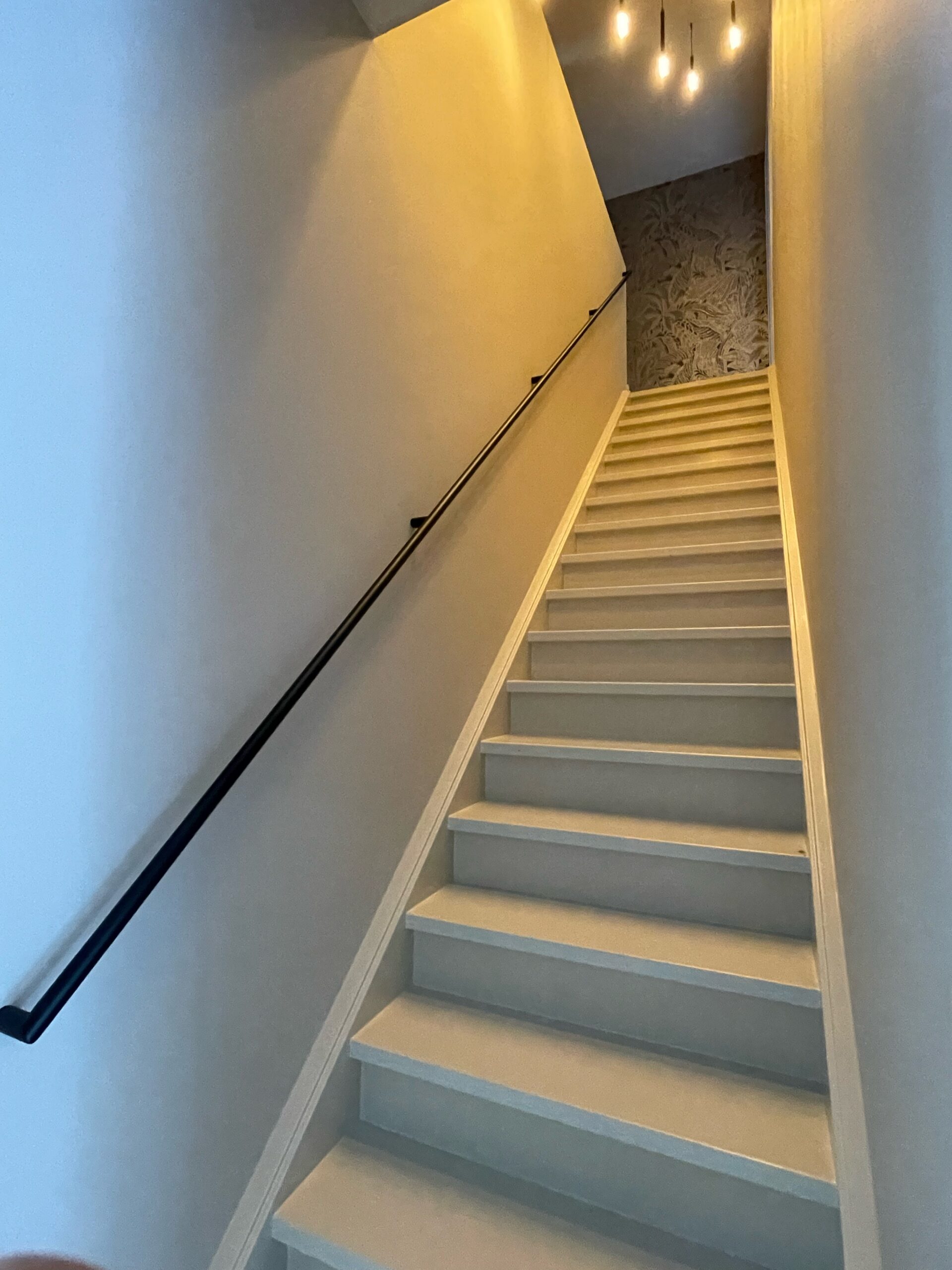 Ronde zwarte trapleuning van ruim 5 meter uit één geheel