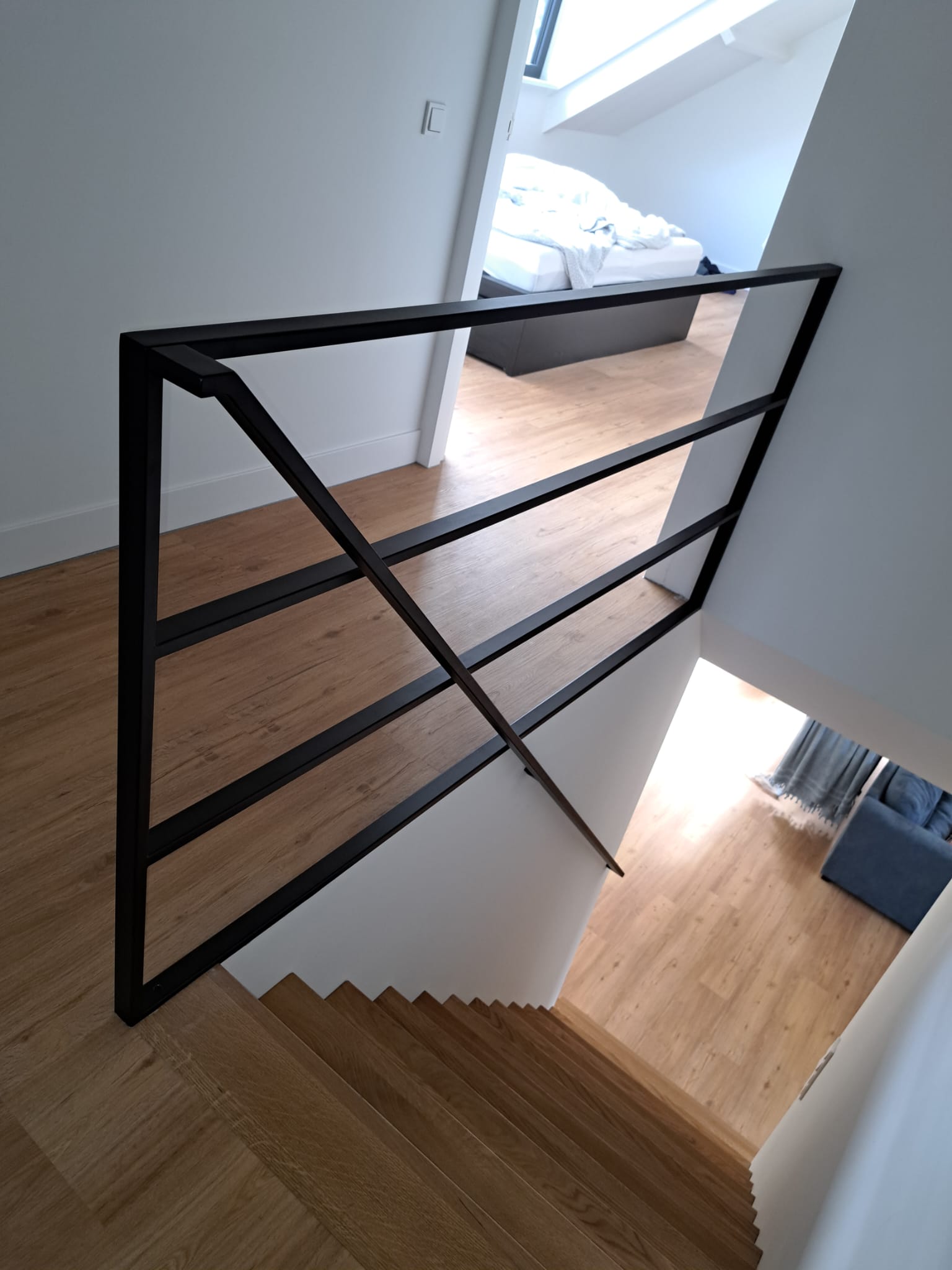 In Noordwijk plaatsen wij deze stalen balustrade / traphek met een aaneengesloten stalen design trapleuning. Uitgevoerd in zwart, wat mooi afsteekt bij de witte wanden en eikenhouten trap.