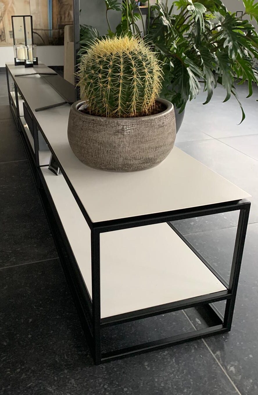 Het had wat meer voeten in de aarde, omdat we de witte platen apart moesten laten poedercoaten en achteraf in het frame moesten monteren (in tegenstelling tot een tv-meubel in 1 kleur).